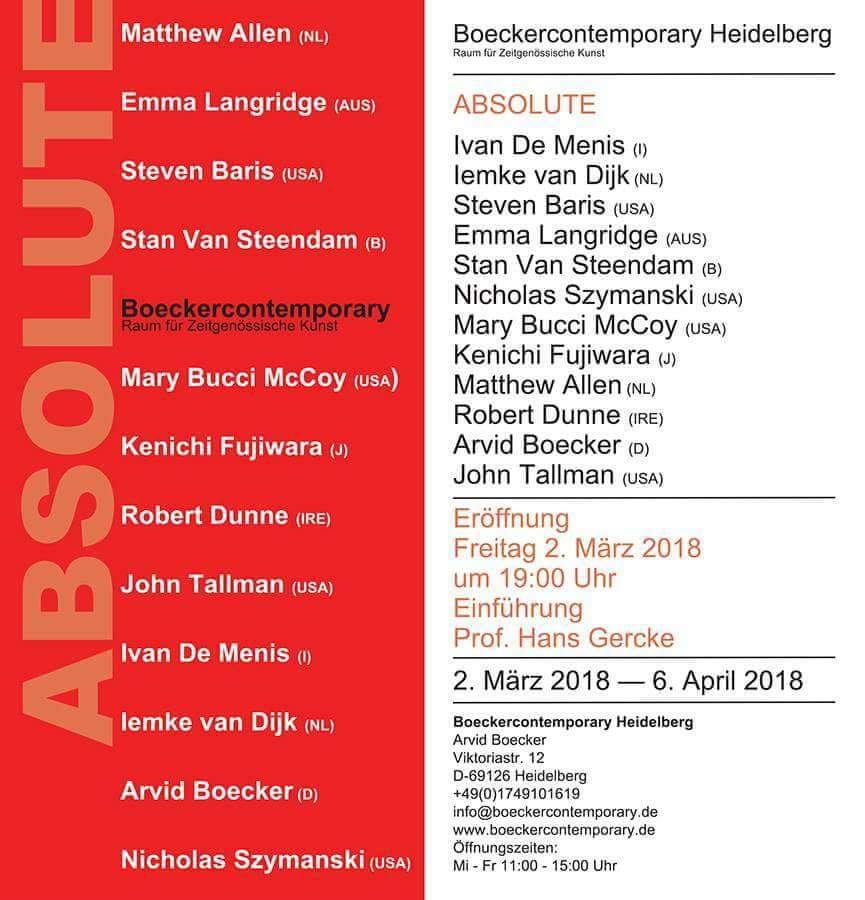 Sally Anderson, Mostyn Bramley Moore, Terri Brooks, Michael Cusack, Robert Dunne, Miles Hall, Brent Hallard, Josey Kidd-Crowe, Moya McKenna, Paul McNeil, David Quinn, Helen O’Leary and John Smith BSA Project Space, Austraila.